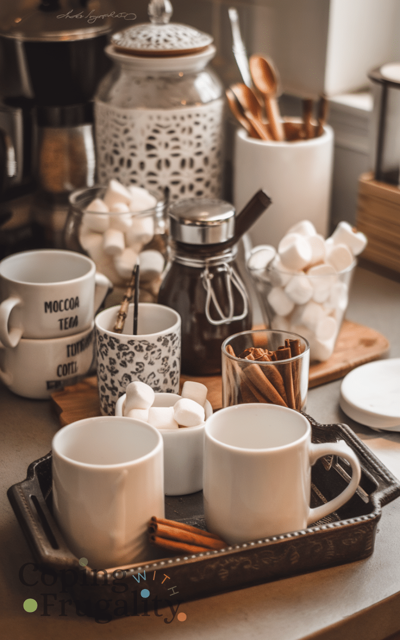 Creating a small hot drink station with mugs, cocoa, tea, or coffee supplies can enhance the cozy atmosphere. Cozy winter kitchen styling on a budget is easy when you dedicate a corner or countertop to a warm beverage setup. Use decorative jars for ingredients and add small trays for mugs or spoons. This makes the kitchen feel functional and inviting, while offering a comforting treat during cold winter mornings. Even simple touches like arranging marshmallows or cinnamon sticks in clear containers contribute to the warm, cozy feel without any major expense, turning your kitchen into a winter haven.