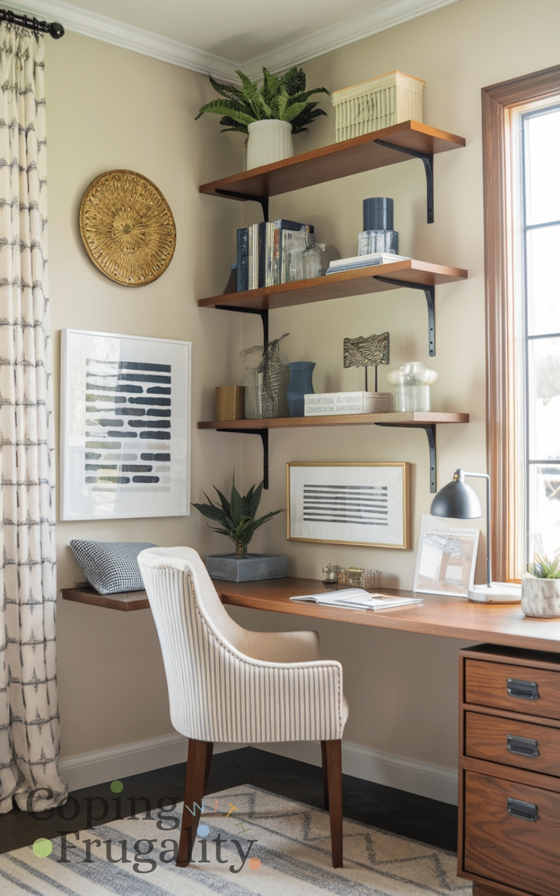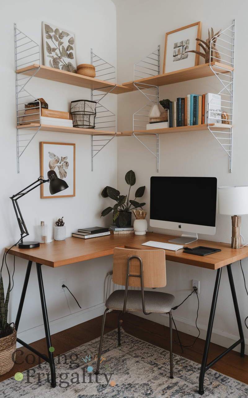 Floating shelves are an excellent addition to a home office corner setup on a budget. They keep your office supplies and decorative items off the desk, making your workspace feel clutter-free. You can make your own with inexpensive wood planks and brackets or buy affordable pre-made versions. Floating shelves also add visual interest to your corner and can be arranged creatively. This simple addition turns your budget-friendly home office corner setup into a stylish and organized area for work or study.