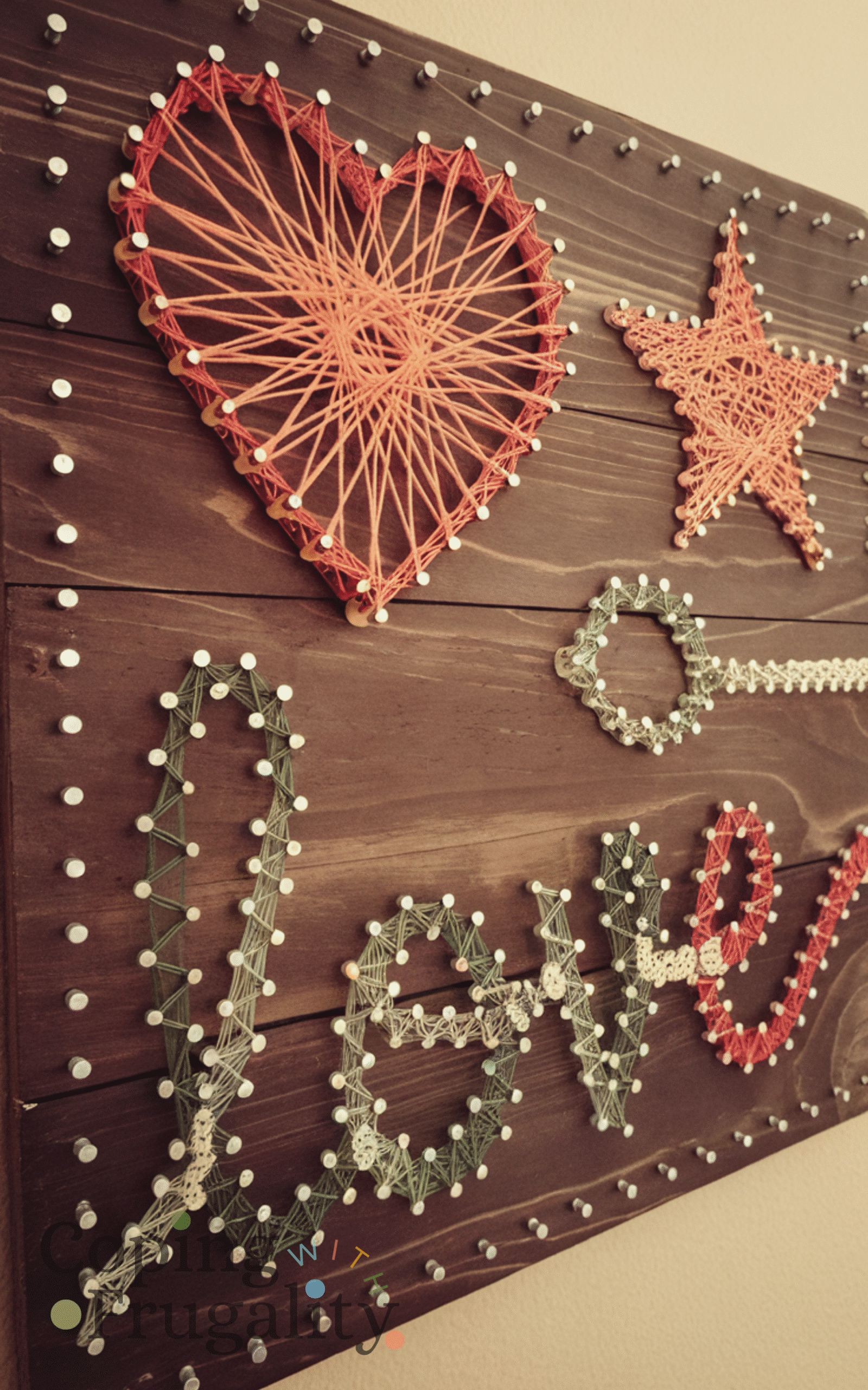String art is a trendy and easy DIY wall art idea on a budget that allows you to design beautiful patterns using nails and thread and you can draw a heart star or your favorite word on a wooden board then wrap colorful string around the nails to create an artistic design and it is simple affordable and adds a handmade touch to your wall decor.