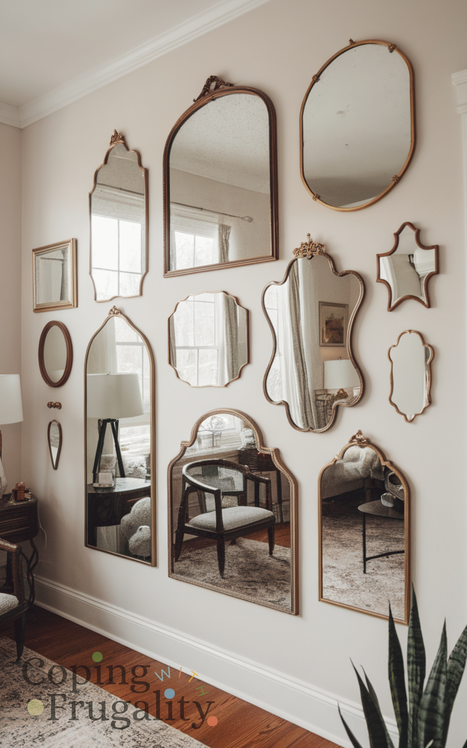 Instead of buying expensive decor you can make a mirror wall display using affordable small mirrors which is a clever DIY wall art idea on a budget and you can arrange different mirror shapes on your wall to create a chic reflective design that makes your space look bigger and brighter.