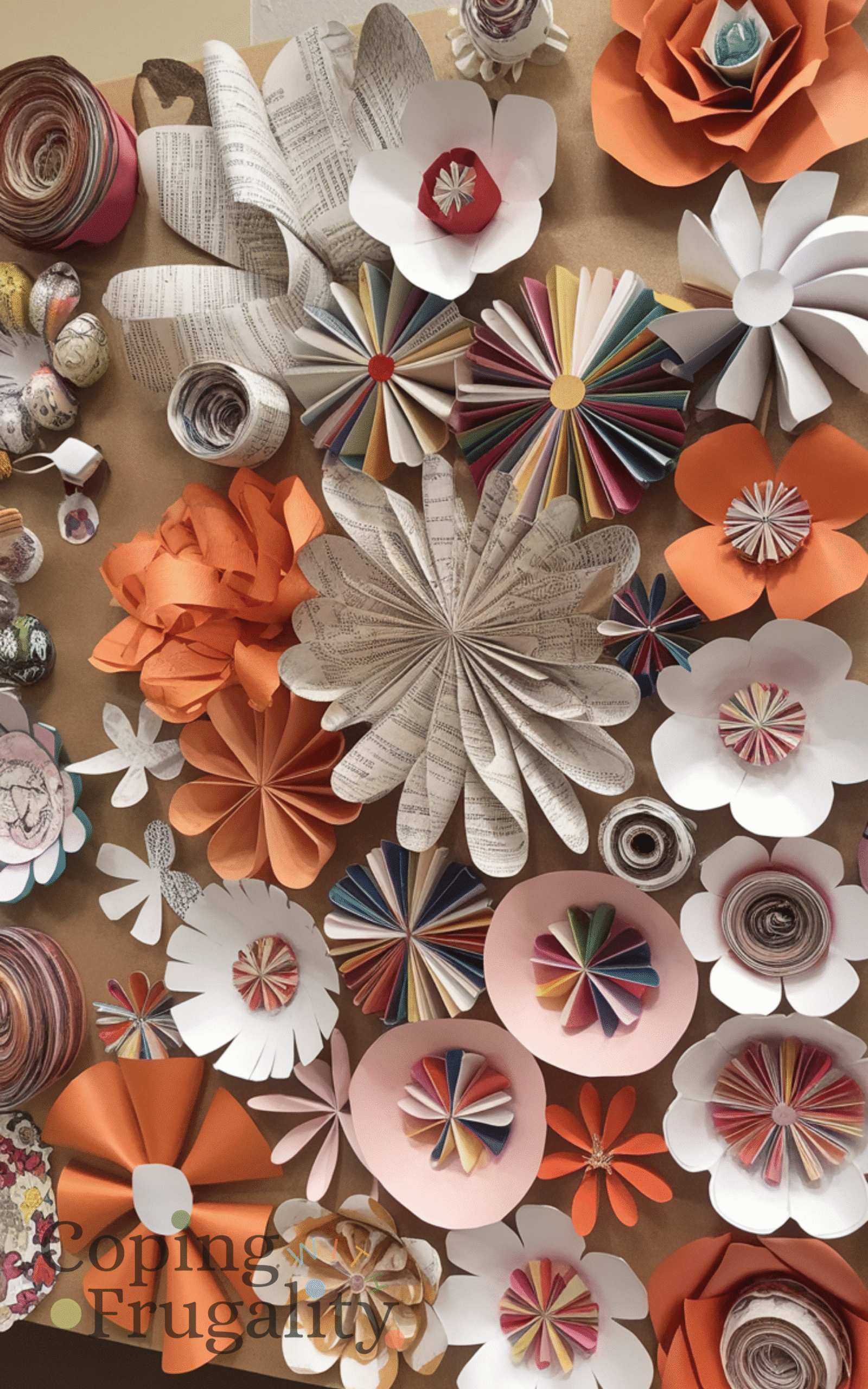 If you love crafting then making paper flowers is one of the best DIY wall art ideas on a budget that brings charm and color to your walls and you can use colored paper or even recycled pages to create flowers of different shapes and sizes then attach them to a large board or arrange them directly on the wall and this handmade decoration adds a romantic and cheerful vibe that brightens up any room.