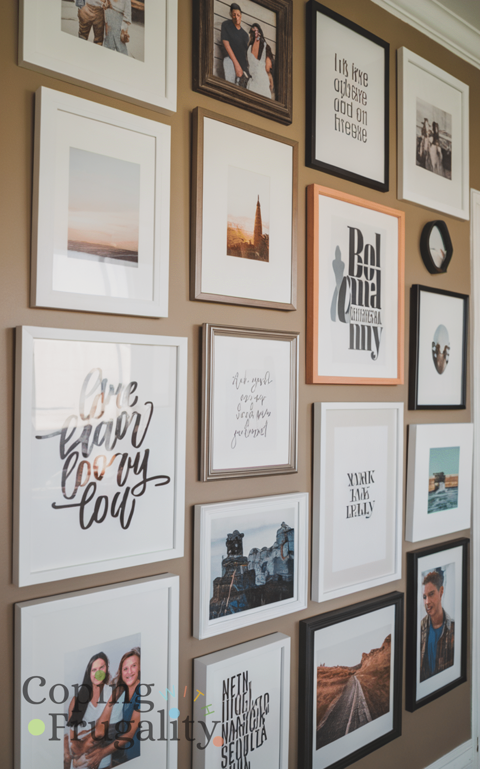 A gallery wall is a meaningful and affordable DIY wall art idea on a budget that tells your story through photos and prints and you can gather your favorite family photos travel shots or inspirational quotes then frame them in various sizes and arrange them in a creative pattern on your wall to make it look stylish and personal and this idea not only adds visual interest but also fills your space with memories and joy.