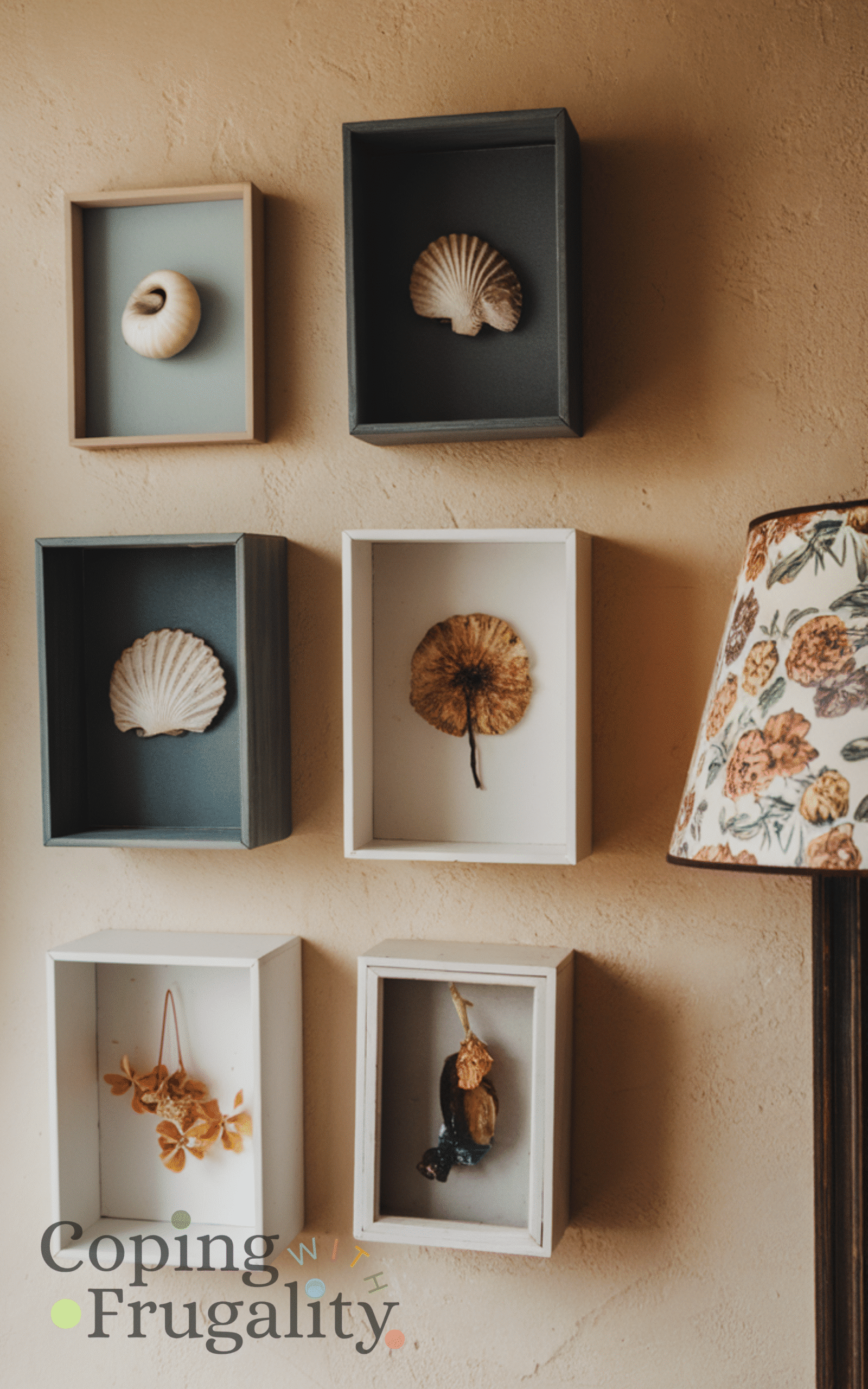 Shadow boxes are perfect for displaying small keepsakes which makes them a meaningful DIY wall art idea on a budget and you can showcase shells dried flowers or souvenirs in each box to create a wall full of memories and it is simple affordable and very personal.
