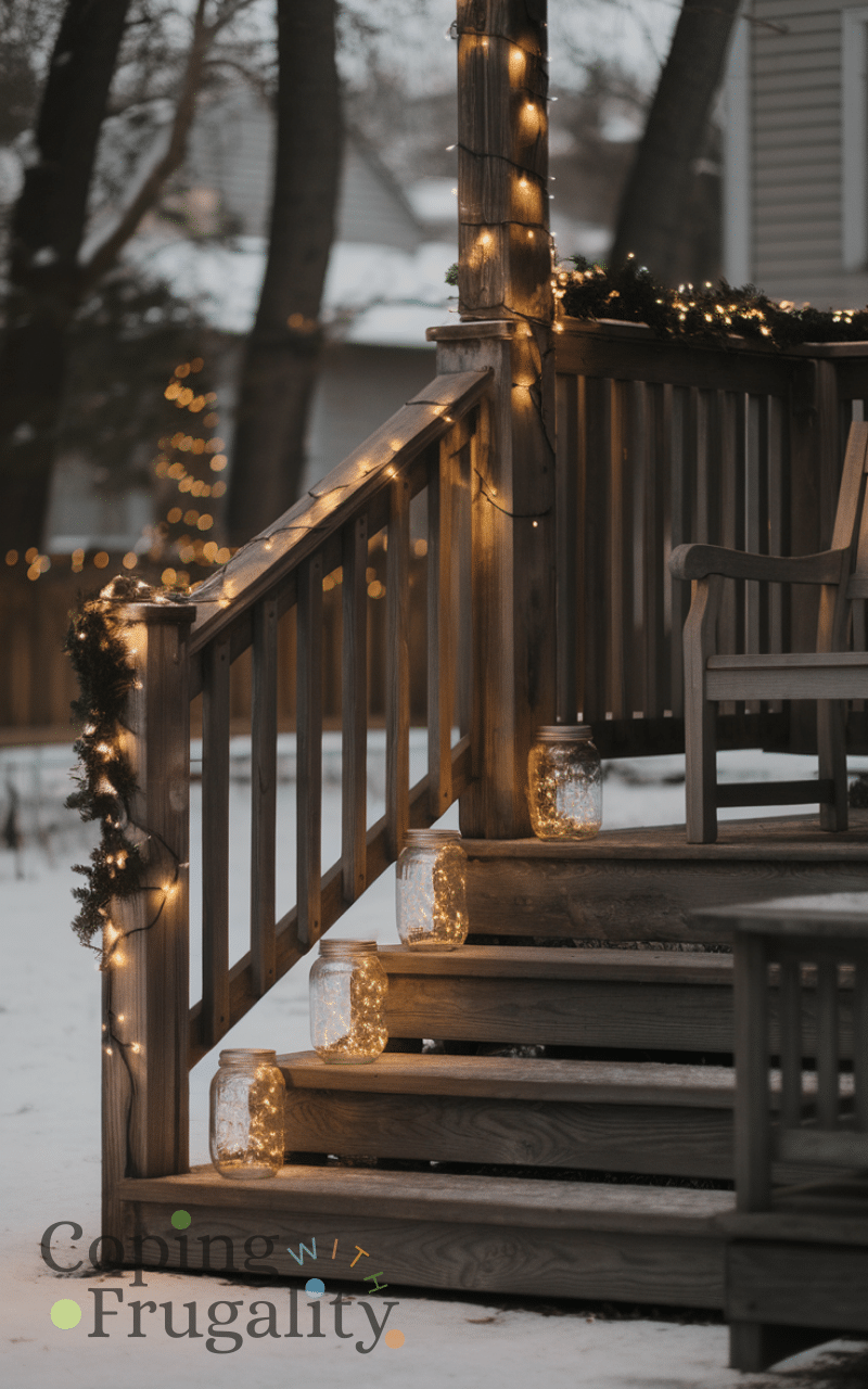 Create custom winter lighting with mason jars, fairy lights, or candles. Place them along steps, railings, or tables to enhance the cozy ambiance. DIY lighting is cost-effective, creative, and instantly elevates the look of your porch. This final touch completes your easy front porch makeover ideas for winter on a budget, adding warmth, sparkle, and a welcoming glow that transforms your entryway into a charming winter retreat.