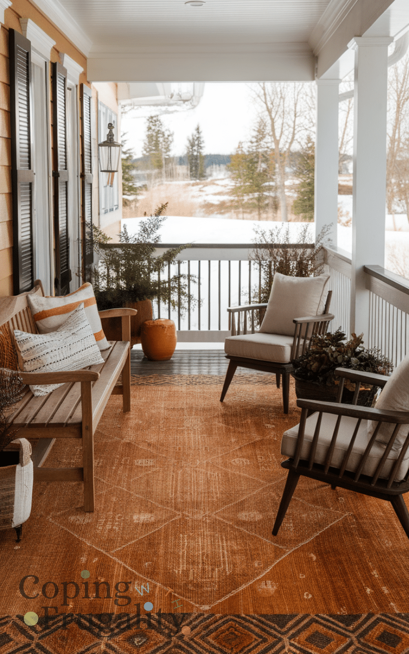 Add warmth and style to your winter porch with an outdoor rug. Choose durable, water-resistant rugs with rich textures or patterns to create a cozy sitting area. Rugs define the space, making it feel more like an extension of your home. A carefully chosen rug is an easy, affordable way to enhance your porch’s aesthetic and comfort. Incorporating this in your easy front porch makeover ideas for winter on a budget instantly elevates the space, inviting you and your guests to linger longer in a stylish, cozy environment.