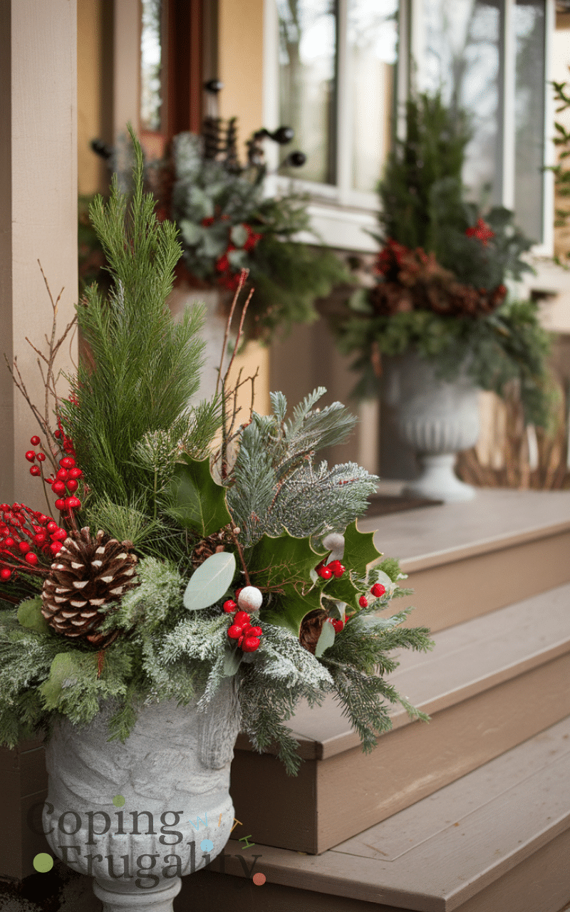 Window boxes filled with winter greenery or seasonal decorations bring charm and depth to your porch. Use evergreen branches, ornamental grasses, or fake snow for a low-maintenance but festive touch. This affordable addition adds visual interest and layers to your winter porch décor. Window boxes are a simple, creative way to enhance your easy front porch makeover ideas for winter on a budget, adding curb appeal and a cheerful vibe that brightens up the exterior of your home.