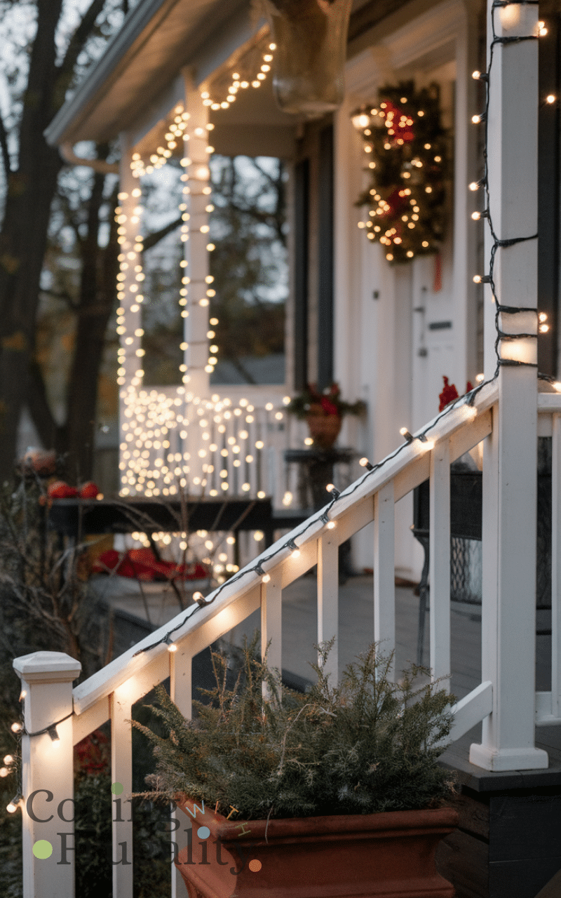 String lights aren’t just for the holidays—they can add a magical touch to your winter front porch all season long. Wrap them around railings, banisters, or outdoor planters to create a cozy and welcoming glow. Opt for warm white LED lights to keep energy costs low while enhancing the winter vibe. String lights are an easy and inexpensive element that instantly uplifts your porch’s appearance. Adding this feature to your easy front porch makeover ideas for winter on a budget will make your space feel festive, cheerful, and inviting for both family and guests.
