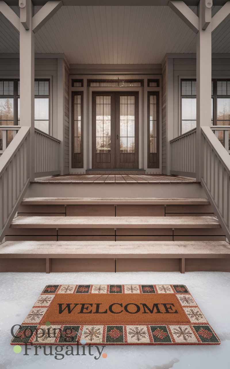 A cozy welcome mat is a simple and affordable way to transform your front porch this season. Choose mats with warm textures, festive patterns, or seasonal colors that make guests feel instantly welcome. A winter-themed mat not only adds charm but also helps keep your entryway clean during snowy or rainy days. By switching out your old mat for a fresh, inviting one, you give your porch a budget-friendly update that instantly brightens the space. This idea works perfectly for an easy front porch makeover in winter, creating a warm, inviting first impression without breaking the bank.