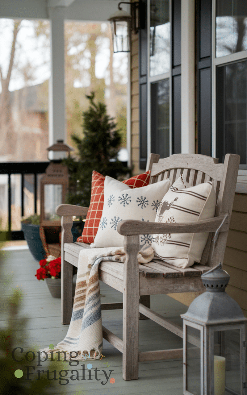 Creating a small seating area can make your porch feel warm and functional. A rustic wooden bench or repurposed seating can often be found cheaply or even DIYed. Decorate it with seasonal pillows and throws to enhance comfort and style. Adding seating is a practical and charming idea that enhances the overall look of your winter porch. This is a standout addition to your easy front porch makeover ideas for winter on a budget, combining affordability, charm, and functionality.