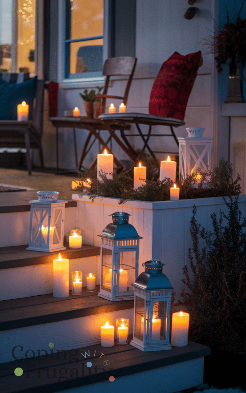 Lanterns and candles add an enchanting glow to your winter porch. You can use battery-operated candles for safety and long-lasting light. Arrange them on steps, tables, or alongside planters to create a magical, cozy ambiance. Lanterns are a budget-friendly way to introduce warmth and charm while keeping your porch stylish during the darker winter evenings. Incorporating this into your easy front porch makeover ideas for winter on a budget is a simple yet impactful update that makes your space feel inviting and serene.