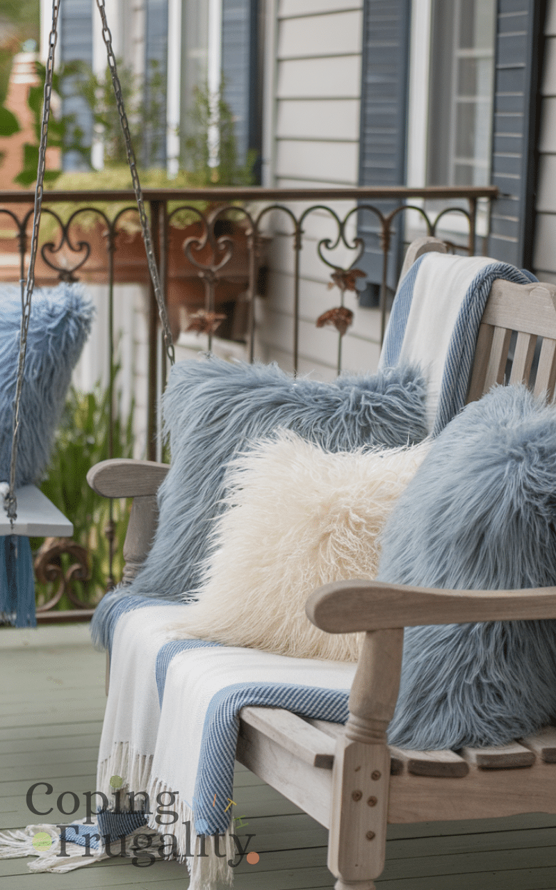 Spruce up porch seating with cozy pillows and warm throws. Choose materials that withstand the cold but are soft enough to create a comfortable, inviting vibe. Layering colors and textures instantly transforms benches, chairs, or swings into welcoming spots for guests. This simple addition is perfect for an easy front porch makeover idea for winter on a budget, combining style and comfort. Even a small investment in a few seasonal textiles can make your porch look stylish and feel cozy throughout the chilly months.