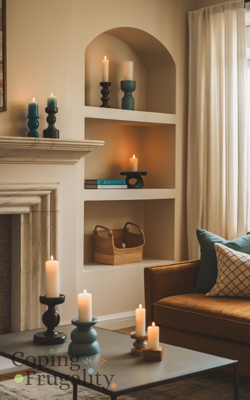 Candles are a budget-friendly and charming addition to layered lighting. Use them in clusters or holders on shelves, tables, or mantels to add soft, flickering ambiance. While inexpensive, they create depth, warmth, and a cozy atmosphere that complements other lighting layers, making your home feel inviting, stylish, and well-lit on a budget.