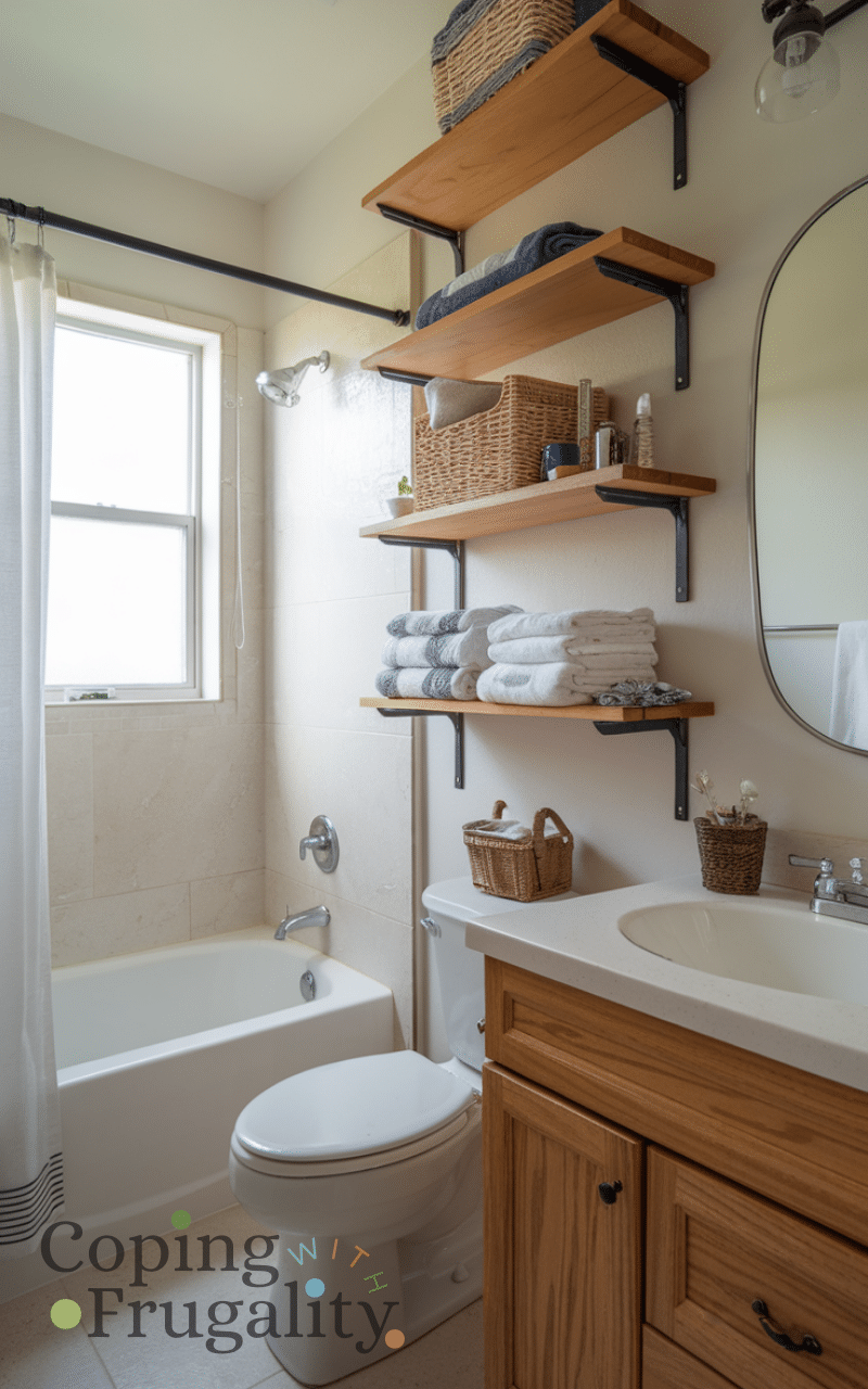 Replacing bulky cabinets with open shelves is perfect for small spaces. This easy small bathroom makeover on a budget idea keeps essentials accessible while making the room feel airy. Wooden or metal shelves are affordable and easy to install. Styling them with towels, baskets, and small decor items keeps the bathroom organized and visually appealing.