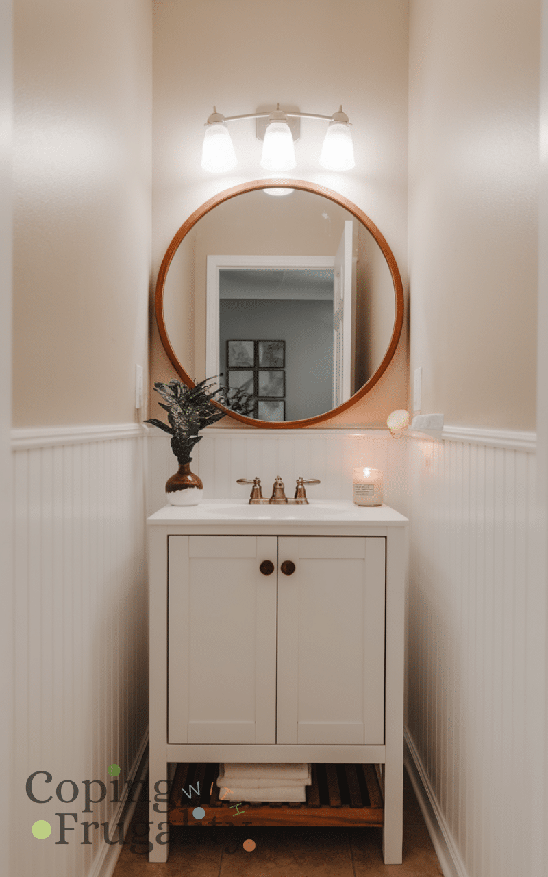 A new mirror can visually double the size of a small bathroom. This easy small bathroom makeover on a budget trick works because mirrors reflect light and open up the space. Round mirrors add softness, while rectangular ones feel modern and clean. You don’t need an expensive piece, even a simple framed mirror can elevate your vanity area instantly.