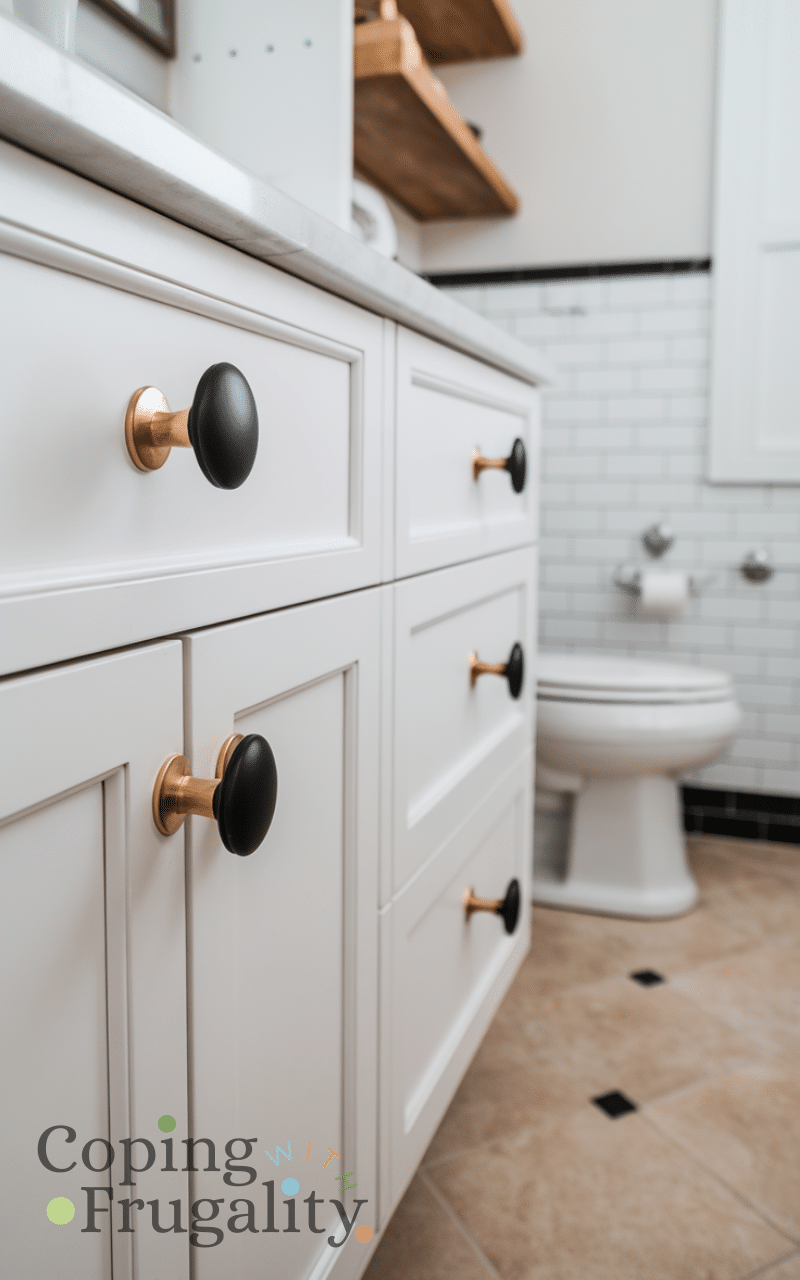 Swapping out old cabinet knobs, drawer pulls, and towel hooks is a quick win. This easy small bathroom makeover on a budget idea adds a modern or classic touch without renovation. Matte black, brushed gold, or chrome hardware can refresh the entire look. These small details may seem minor, but together they create a noticeable transformation that feels intentional and updated.