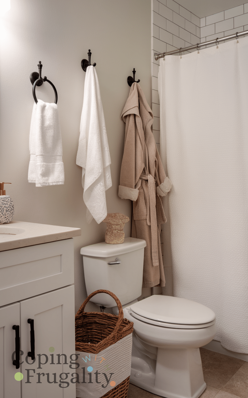 Wall hooks save space and add style. This easy small bathroom makeover on a budget idea is perfect for towels, robes, or baskets. Hooks take up less room than traditional towel bars and help keep the bathroom neat. They’re affordable, practical, and easy to install.
