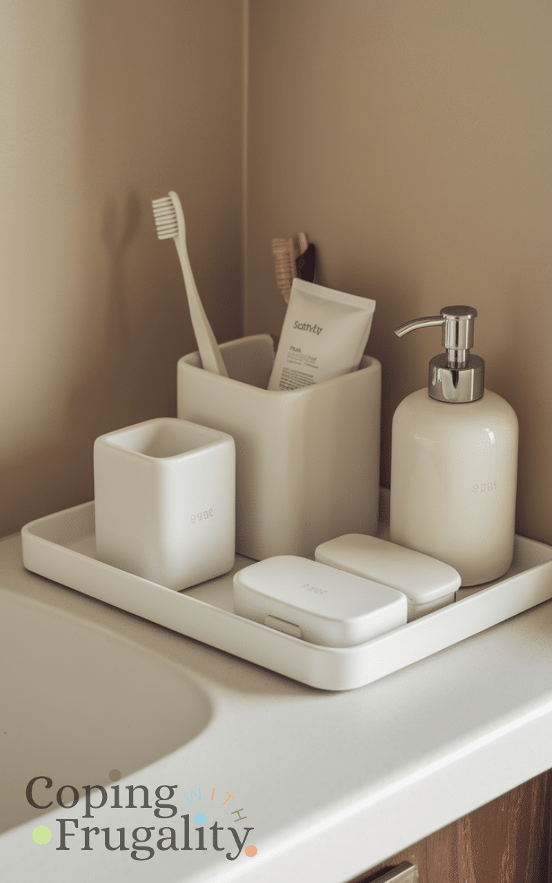 Keeping the countertop minimal makes a small bathroom feel more spacious. This easy small bathroom makeover on a budget tip includes using a tray, matching containers, and removing unnecessary items. A clean countertop instantly creates a polished and organized look without spending money on renovations.
