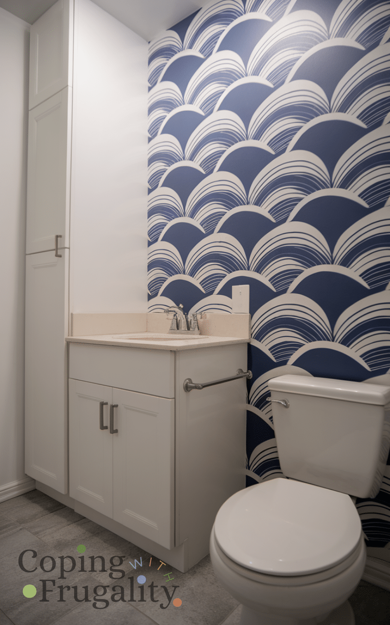 Peel-and-stick wallpaper is a game changer for renters and budget makeovers. This easy small bathroom makeover on a budget option adds pattern and interest without commitment. Use it on one accent wall or behind the vanity for a bold look. It’s easy to apply, remove, and refresh whenever you want a new style.