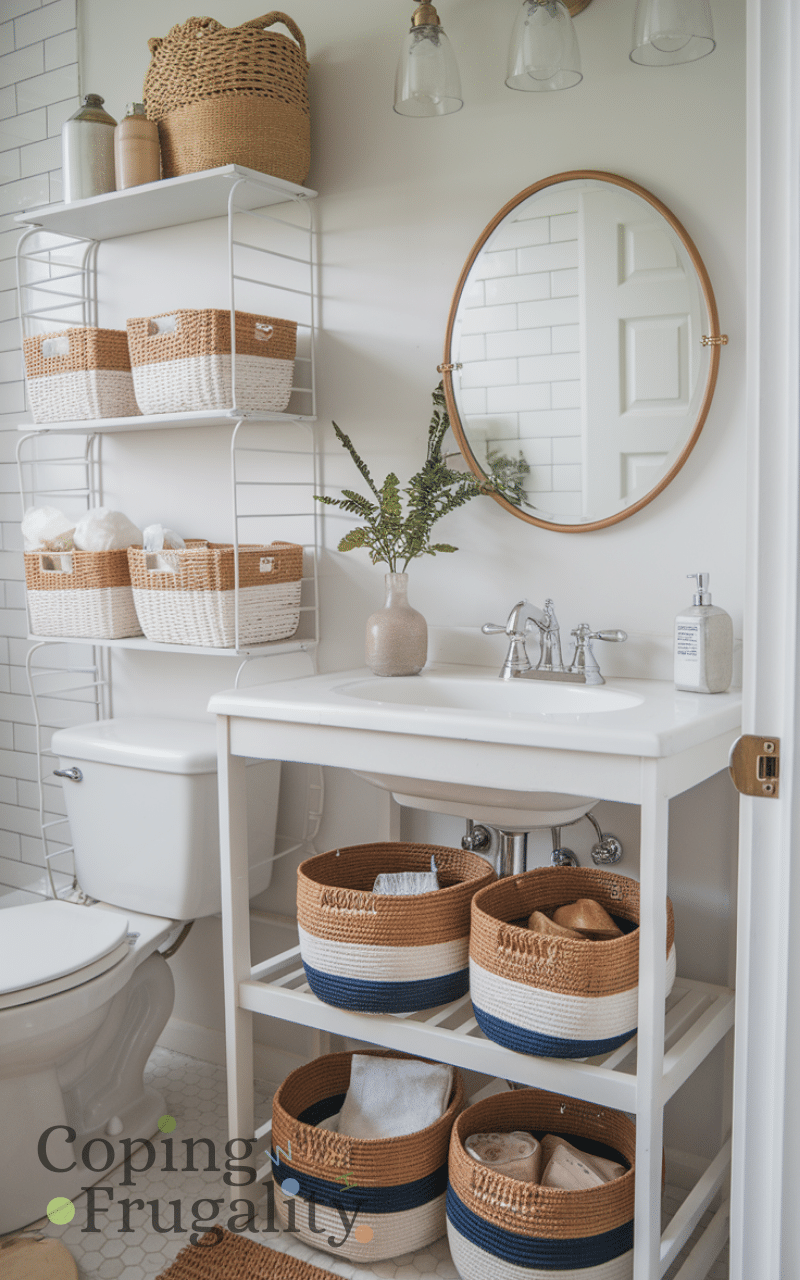 Baskets are both functional and decorative. This easy small bathroom makeover on a budget idea helps hide clutter while adding texture and warmth. Use baskets under the sink or on shelves for towels and toiletries. Woven or fabric baskets are affordable and make your bathroom feel calm and well-organized.