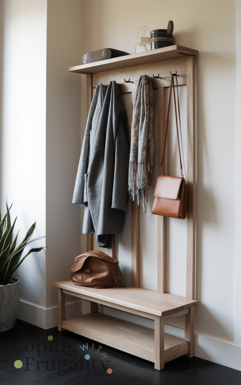 A chic coat rack can be both functional and decorative. Whether it’s a free-standing piece or wall-mounted hooks, it helps keep jackets, bags, and scarves neatly organized. Pick one that matches your entryway theme, from modern metal to rustic wood. It keeps the space tidy while adding visual interest, showing guests that your entryway is thoughtful and stylish. Incorporating a coat rack is an effortless step in achieving an easy small entryway makeover on a budget, proving practicality can look stunning.