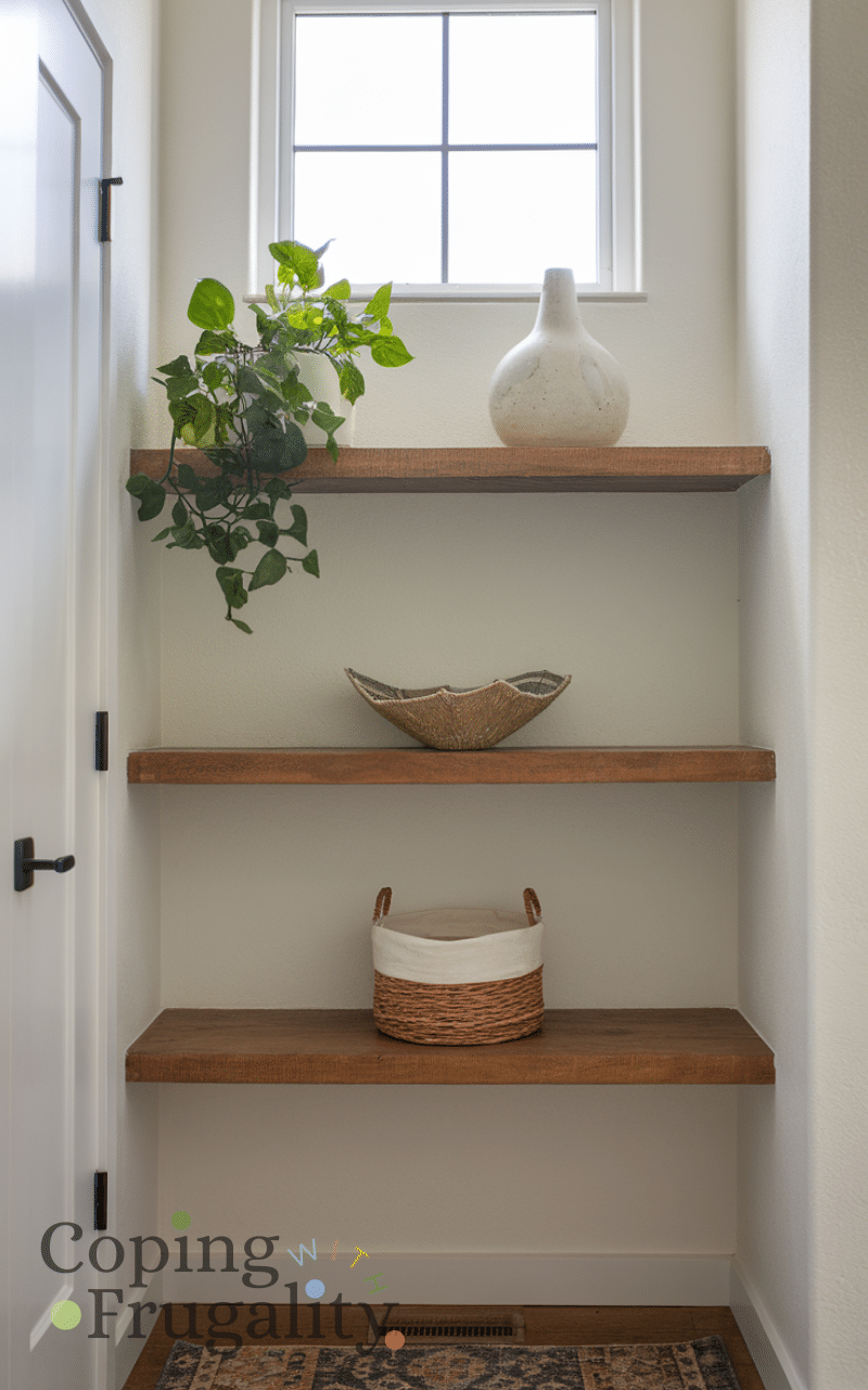 Floating shelves are a perfect solution for small entryways, offering both style and storage. You can display decorative items like vases or photos while keeping essentials like keys and mail neatly organized. They don’t take up floor space, making your entryway feel open and airy. Floating shelves come in various sizes and finishes, so you can match them to your aesthetic. Adding them is an excellent tip for an easy small entryway makeover on a budget, showing that even a tiny wall can become a focal point that wows guests.