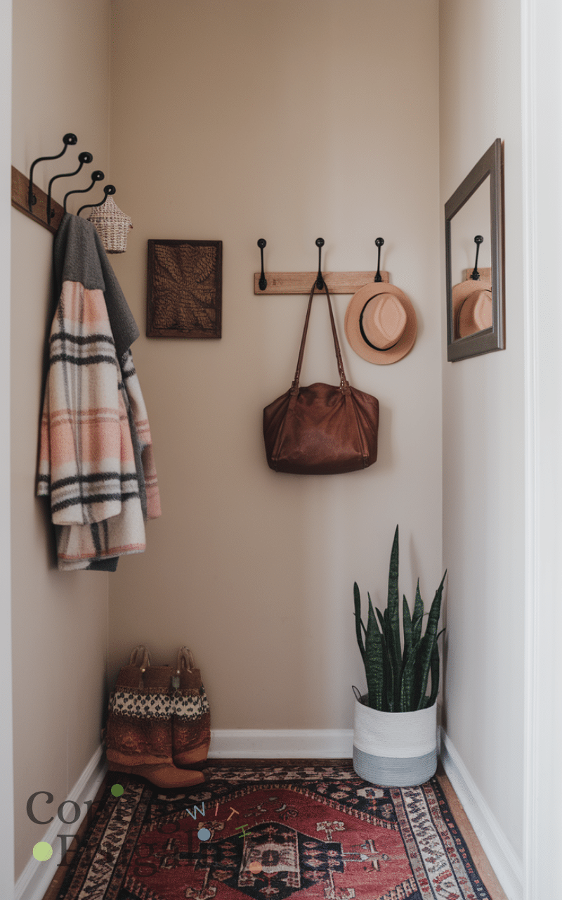 Wall hooks are inexpensive and versatile, providing a place for coats, bags, hats, or even decorative accents. They free up floor space while keeping the area organized and accessible. Stylish hooks can double as decorative elements, adding charm and personality to a small entryway. Adding wall hooks is a simple, budget-friendly trick for an easy small entryway makeover on a budget that maximizes both style and functionality.