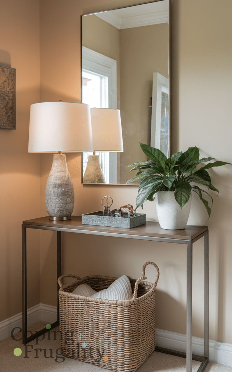 A slim console table is ideal for a small entryway, offering both surface space and storage without taking over the room. Decorate it with a lamp, plants, or a tray for keys to create a welcoming vignette. Console tables can also hold baskets underneath for extra organization, keeping clutter out of sight. Including this piece is a simple way to elevate your entryway, making it a practical and stylish idea for an easy small entryway makeover on a budget.