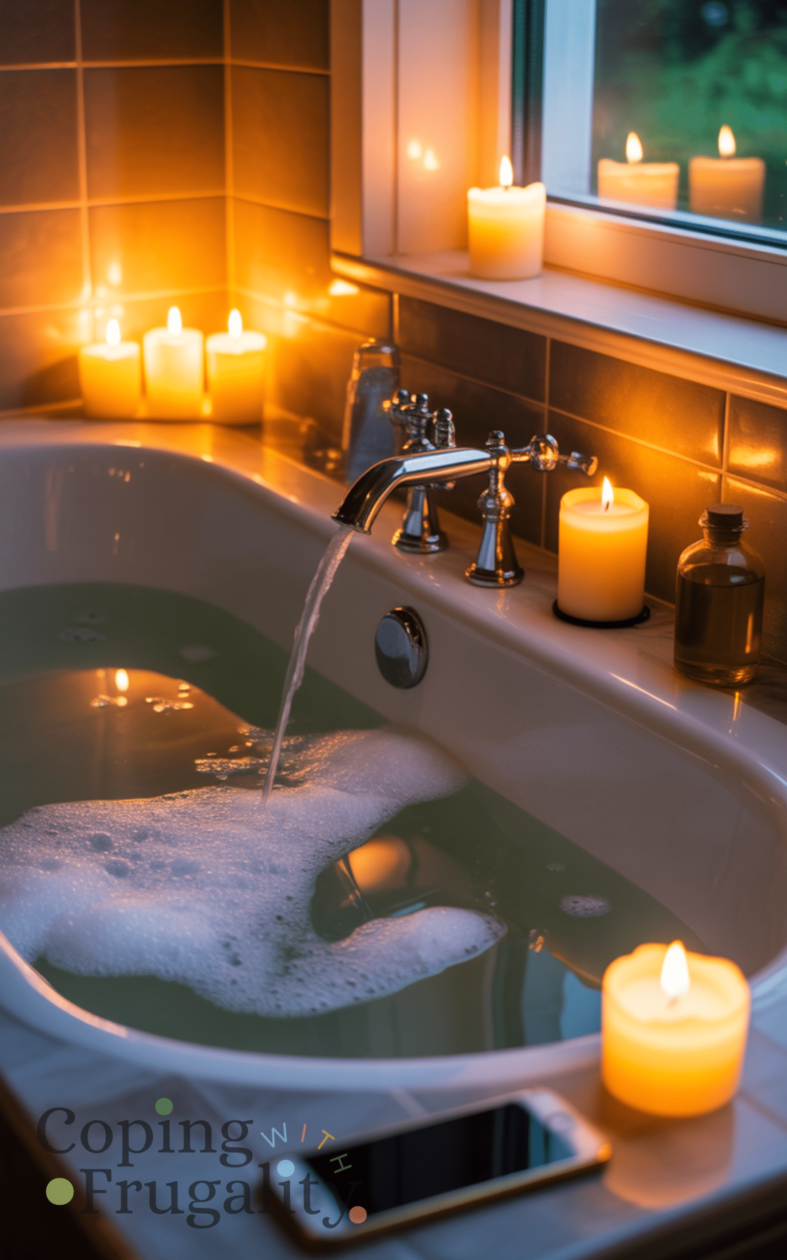 I take relaxing baths with things I already own! I don’t buy expensive bath bombs or special bath products. I add Epsom salt (very cheap at drugstores!), a few drops of olive oil for moisture, or even just bubbles from my dish soap! I light candles (from the dollar store!), play soft music on my phone, and soak for twenty minutes. This costs almost nothing but feels incredibly luxurious!