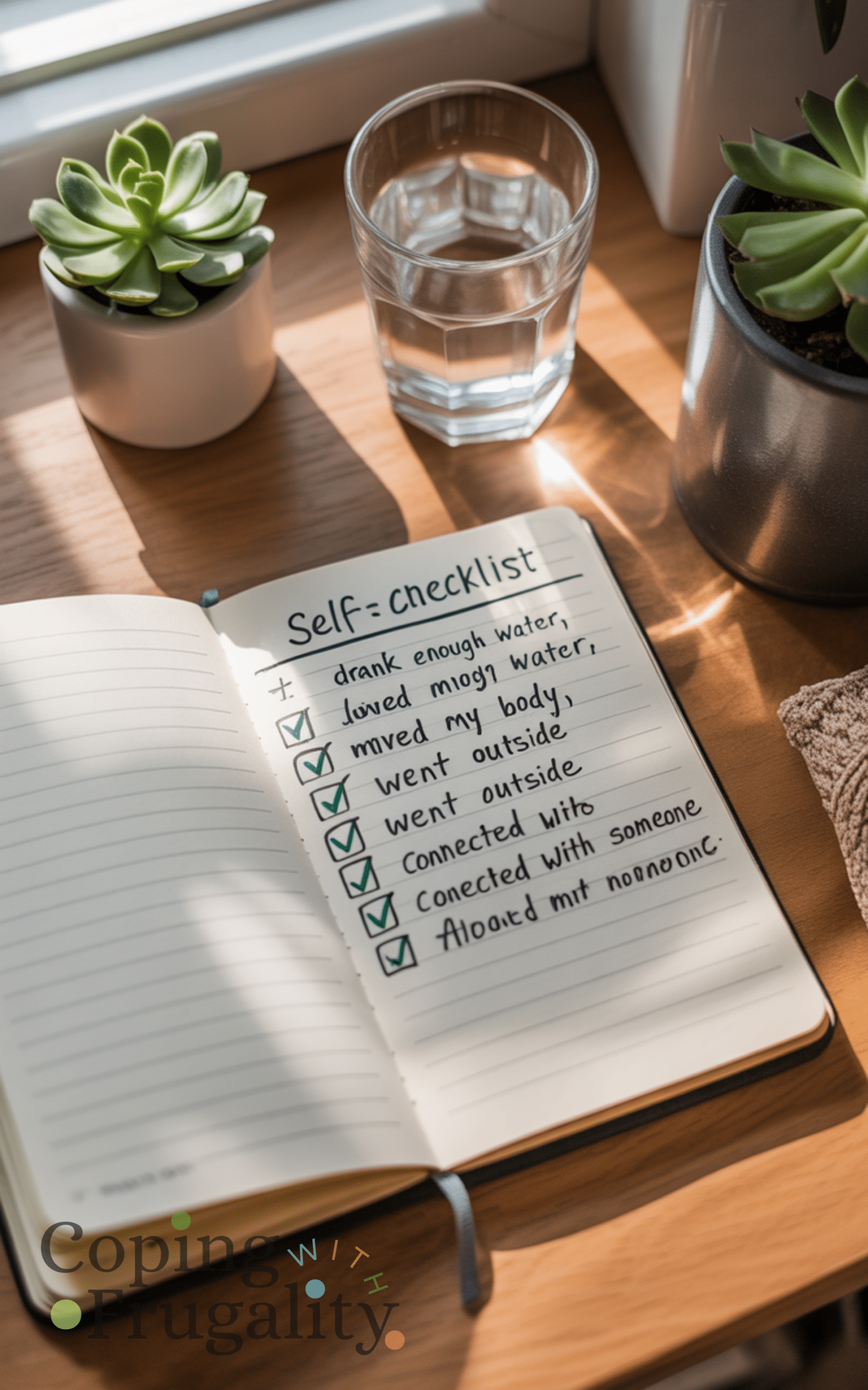 I created a simple self-care checklist in a cheap notebook! Every day, I check off basic self-care tasks – drank enough water, moved my body, went outside, connected with someone, did something fun, got enough sleep. Seeing these checkmarks motivates me to keep going! The notebook cost $1 and lasts for months!