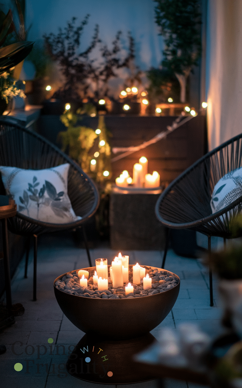 Creating a DIY fire pit or a corner filled with candles can add instant warmth and a cozy glow to your balcony. Use small, safe fire pits or clusters of battery-operated candles for safety and budget-friendliness. This idea makes your balcony makeover for winter on a budget feel magical, stylish, and inviting. The soft flickering light creates ambiance, perfect for relaxing or entertaining, turning your balcony into a winter haven that’s cozy, chic, and budget-friendly without requiring major renovations or expenses.
