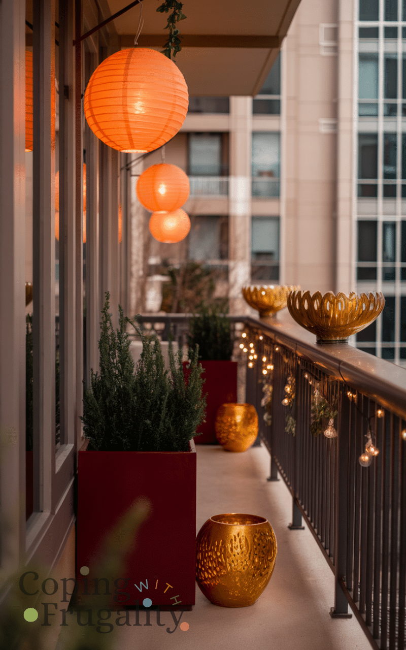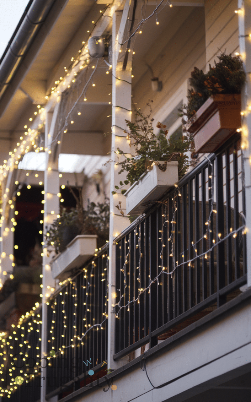 Twinkling fairy lights can completely change the mood of your balcony, creating a magical and cozy winter vibe without spending a fortune. Wrap them around railings, overhead beams, or even in potted plants for a warm, ambient glow. This lighting trick instantly elevates your balcony makeover for winter on a budget, making it feel festive, stylish, and inviting. You can also mix warm white and soft yellow tones to create that perfect cozy winter atmosphere while keeping everything simple and budget-friendly.