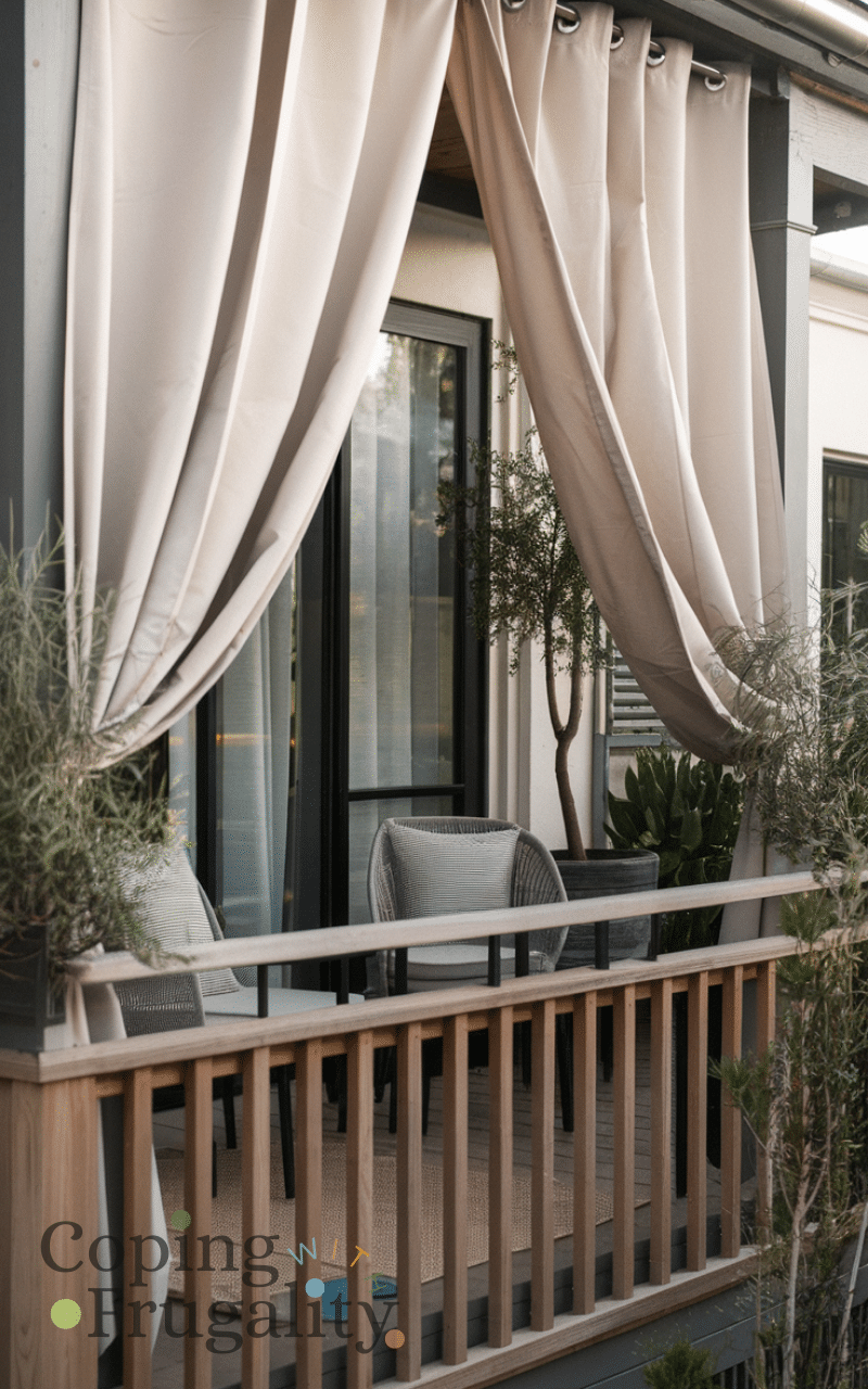 Outdoor curtains are an affordable way to add privacy, warmth, and a touch of elegance to your balcony. Choose thick, weather-resistant fabrics in soft or neutral tones to create a cozy atmosphere. This addition elevates your balcony makeover for winter on a budget, making the space feel like an extension of your home. Pulling the curtains during chilly evenings helps block wind and retain warmth, while keeping the area stylish and inviting. You can also tie them back during sunny days for a flexible, functional, and chic setup.