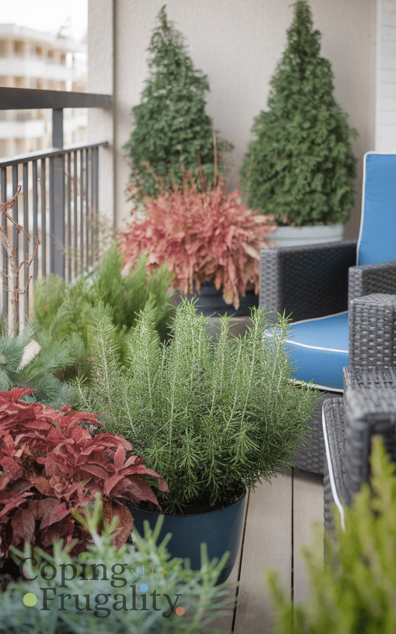 Adding hardy, low-maintenance winter plants can make your balcony feel alive and fresh even in cold months. Evergreen shrubs, rosemary, or small potted conifers bring color and life to your space. Strategically placing them around seating areas enhances your balcony makeover for winter on a budget, giving it a cozy, natural charm. Plants not only make the space stylish but also improve the ambiance, making it a relaxing retreat where you can enjoy winter mornings or evenings in comfort.