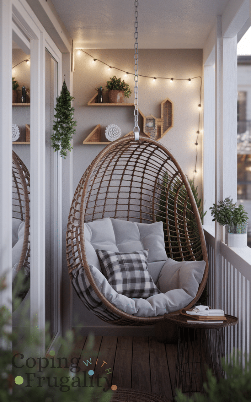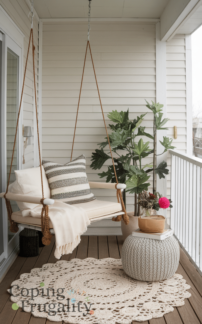 A cozy outdoor rug swing adds warmth, comfort, and a playful touch to your winter balcony. Combine it with cushions and soft throws for a snug seating area. This idea enhances your balcony makeover for winter on a budget, turning it into a stylish retreat that feels inviting and comfortable. Rug swings are affordable, easy to hang, and bring a unique charm that standard furniture cannot, making your balcony feel extra cozy, even in the coldest months, while remaining budget-conscious.