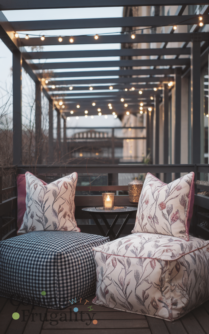 Outdoor poufs or ottomans add extra seating and a cozy vibe without breaking the bank. They are lightweight, portable, and can double as tables. Incorporating them into your balcony makeover for winter on a budget increases functionality while keeping the area stylish. Mix patterns and textures for visual interest, pairing them with blankets and cushions. Poufs make your balcony feel inviting and relaxed, offering a flexible seating option that enhances comfort and charm during chilly winter days or evenings.
