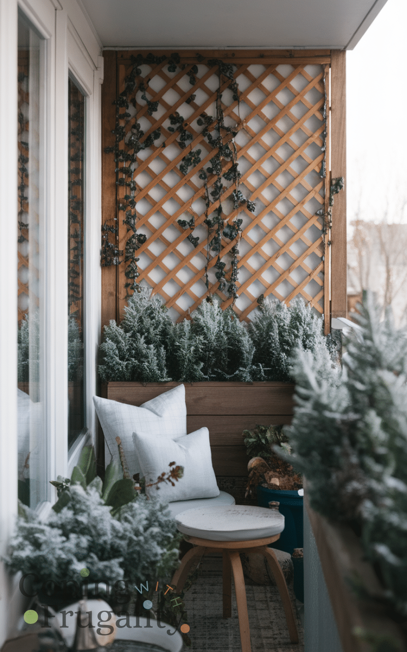 A balcony screen or trellis provides privacy and a cozy, enclosed feel. Add climbing plants or winter greenery to soften the look and create a natural barrier. This idea makes your balcony makeover for winter on a budget stylish, intimate, and inviting. It shields from wind, adds texture, and offers a DIY-friendly option for transforming your balcony. Screens and trellises are budget-friendly, multifunctional, and enhance the overall aesthetic, making your winter balcony a charming and cozy retreat.