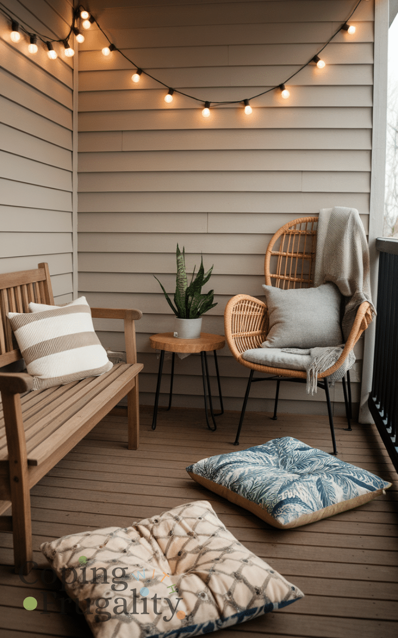Maximize comfort and style by layering seating with benches, chairs, and floor cushions. This approach allows more people to enjoy the balcony while keeping it cozy and stylish. Using affordable, portable pieces ensures your balcony makeover for winter on a budget is practical and flexible. Layered seating invites relaxation, conversation, or solo downtime with ease, turning your balcony into a welcoming winter spot. Mixing textures and sizes makes the space visually appealing while keeping your setup inexpensive and functional.