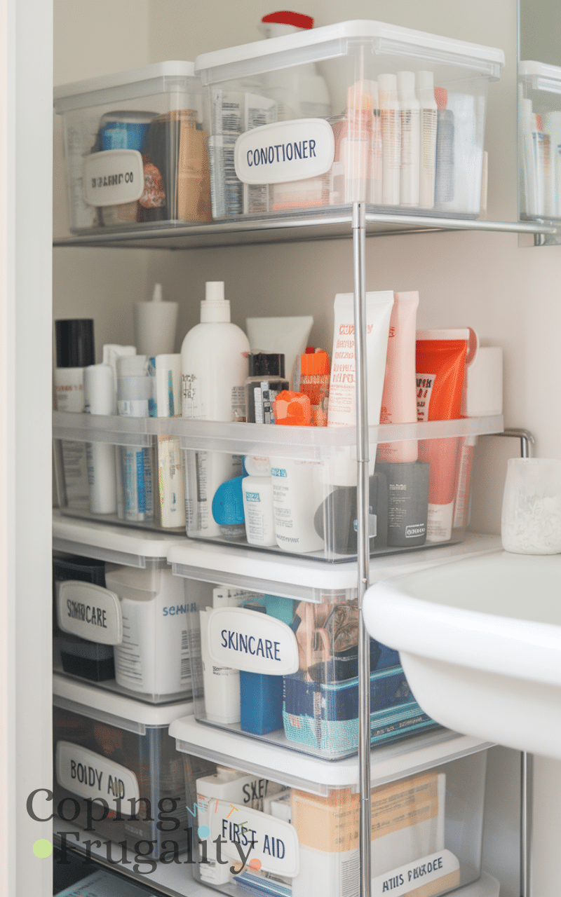 Clear storage bins are a game-changer in any bathroom organization. By following the best bathroom decluttering checklist on a budget that makes organizing super easy, you can group similar items like haircare, skincare, and first aid supplies together. Seeing the contents at a glance saves time and prevents buying duplicates. Budget-friendly bins can be stacked or tucked under sinks, maximizing space. This simple addition keeps your bathroom neat, gives everything a designated spot, and helps maintain a clutter-free space effortlessly, so you can enjoy an organized, stress-free routine every day.
