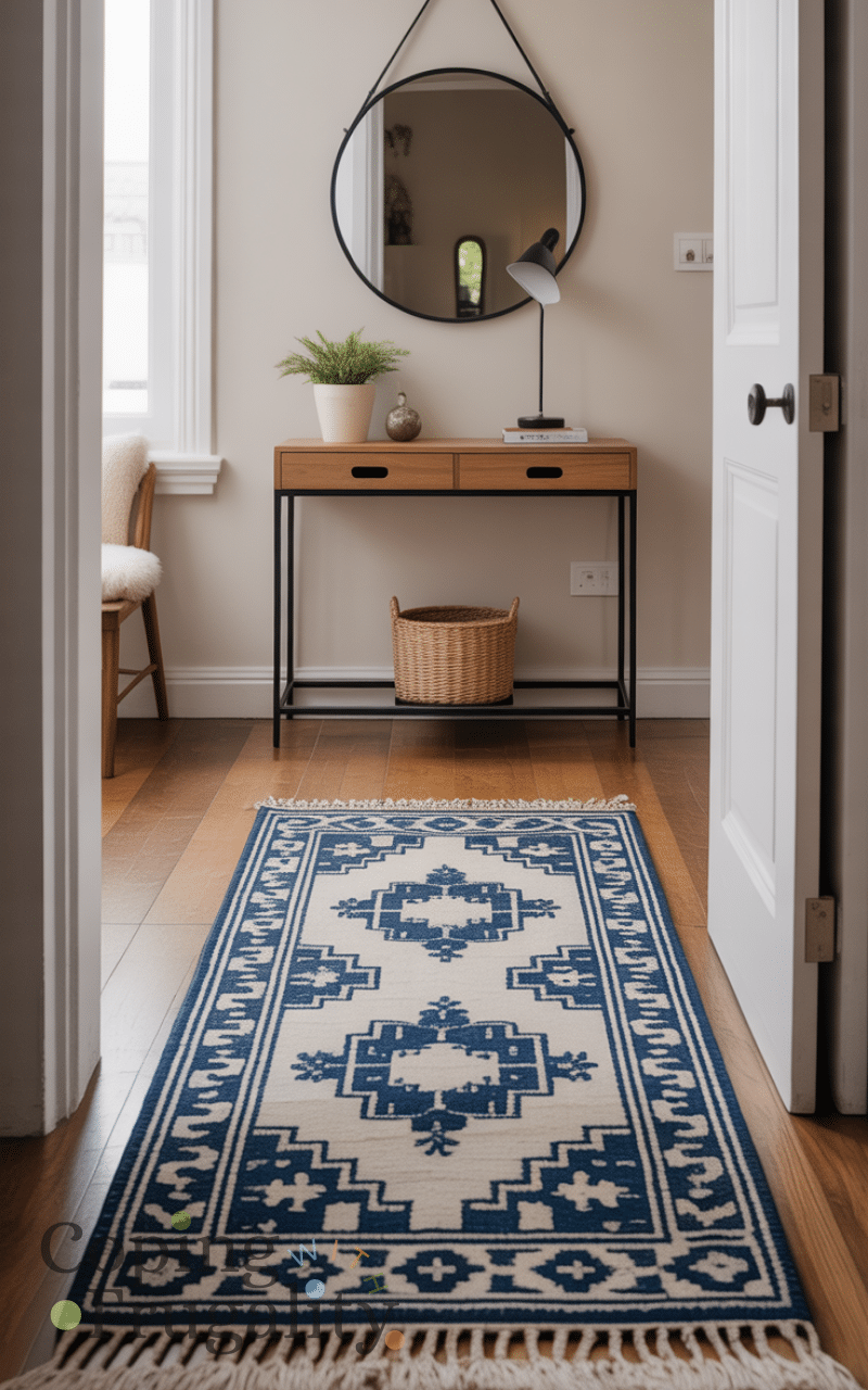 A small rug can completely transform entryway decor for apartments on a budget. It visually defines the entryway, especially in open-plan apartments, and adds comfort underfoot. Look for washable or low-pile rugs that can handle foot traffic. Neutral colors are timeless, but a bold pattern can add personality. Rugs also protect your floors from dirt and wear, making them both stylish and practical.