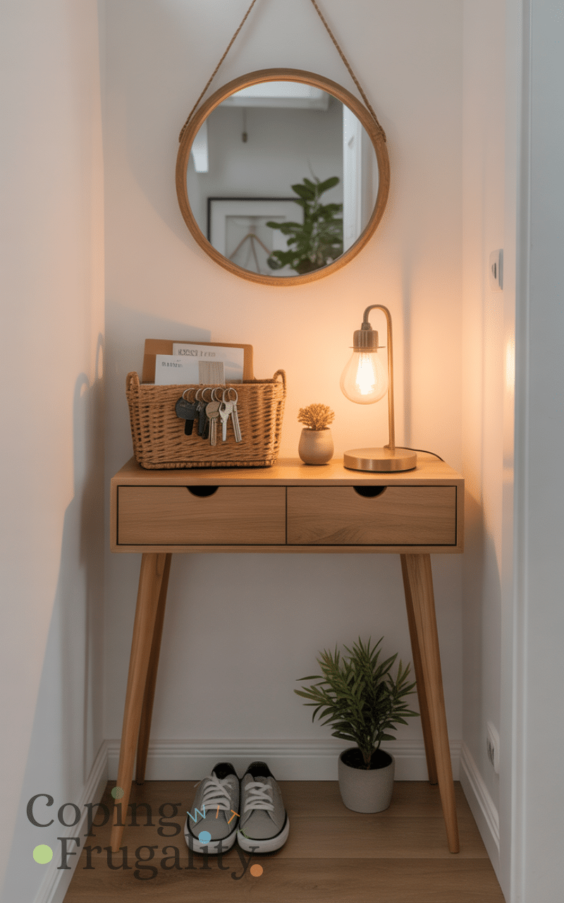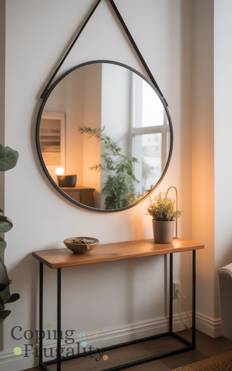 Mirrors are magic when it comes to entryway decor for apartments on a budget. They reflect light and instantly make small entryways feel larger and brighter. You don’t need an expensive designer mirror—thrift stores and discount home shops often have great options. A round mirror adds softness, while a rectangular one feels more modern. Plus, having a mirror by the door is practical for last-minute outfit checks before heading out.