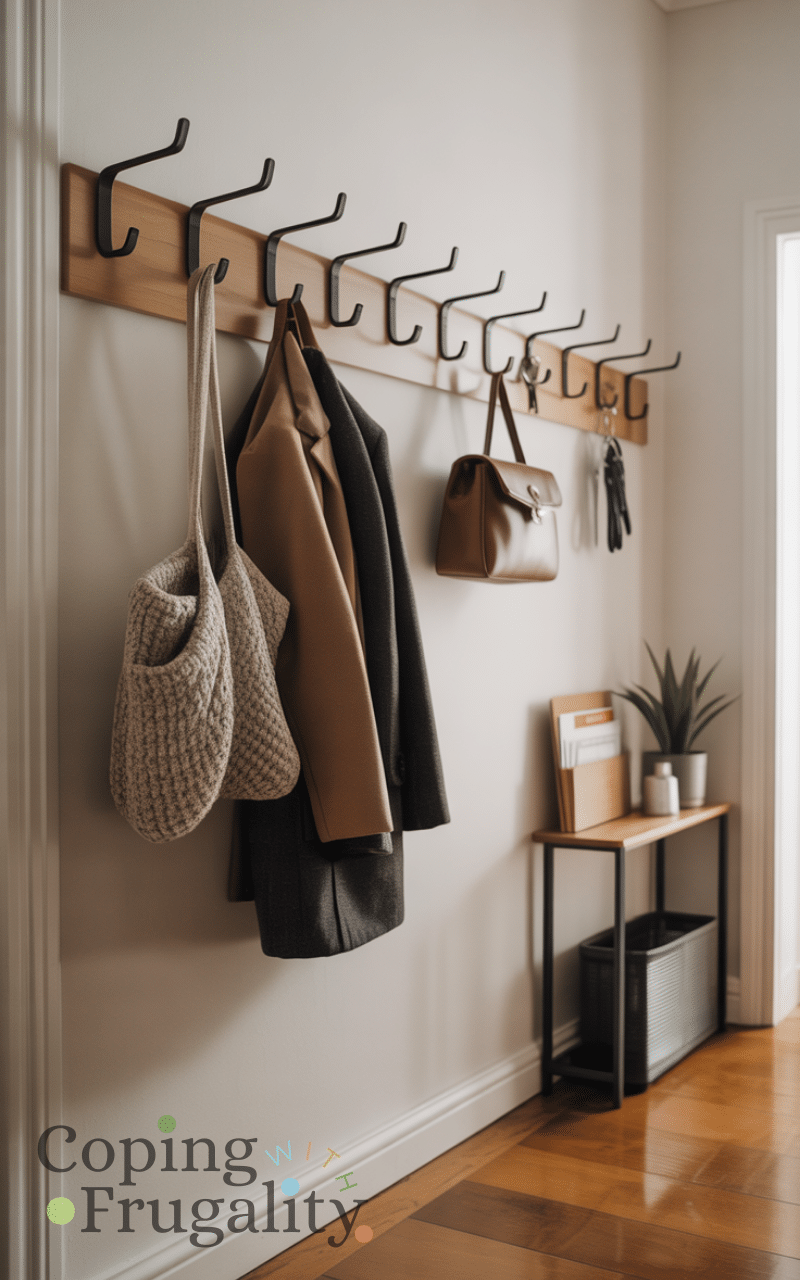 Wall hooks are one of the easiest ways to upgrade entryway decor for apartments on a budget. They take up almost no space while giving you a spot to hang coats, bags, hats, and even keys. Choose adhesive hooks if you’re renting, or go for a simple mounted rail for a cleaner look. Hooks come in endless styles—from minimalist black metal to warm wooden designs—so you can match your apartment’s vibe easily. This small addition keeps clutter off the floor and makes your entryway feel instantly more organized and intentional.
