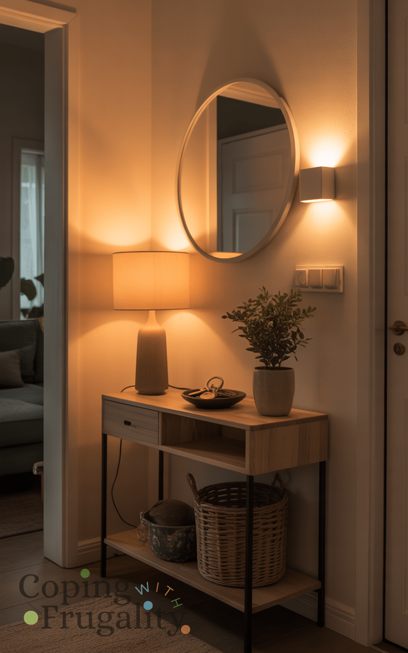 Good lighting can completely change entryway decor for apartments on a budget. If overhead lighting feels harsh, add a small table lamp or plug-in wall sconce. Warm light makes the space feel cozy and welcoming. Budget lighting options are widely available, and even a simple lamp can elevate the entire entryway’s vibe.