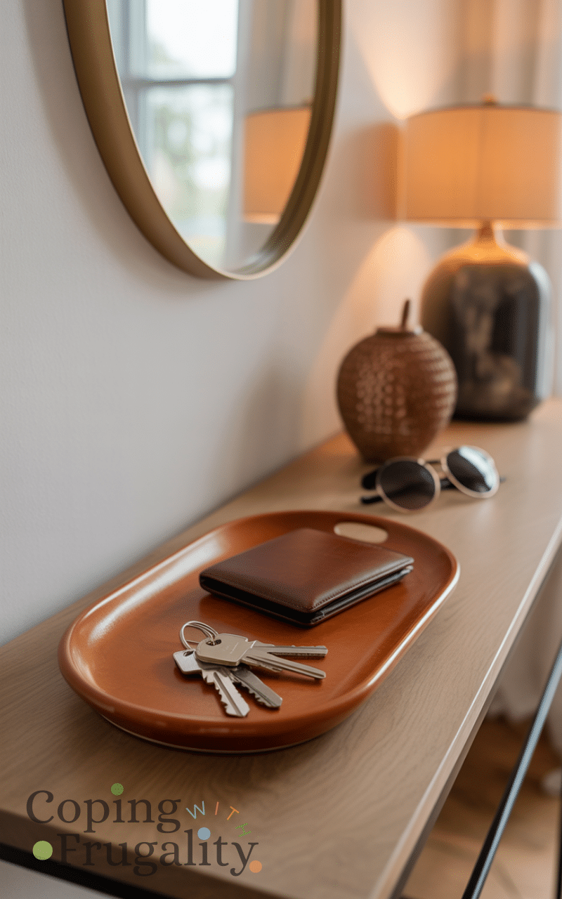 Trays are underrated in entryway decor for apartments on a budget. They keep keys, wallets, and sunglasses in one place, reducing daily stress and clutter. Choose a tray that matches your style—wood, metal, or ceramic all work beautifully. A small tray on a console table or shelf adds structure and makes your entryway feel organized without spending much.