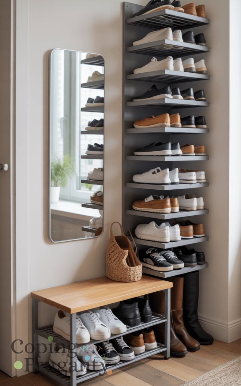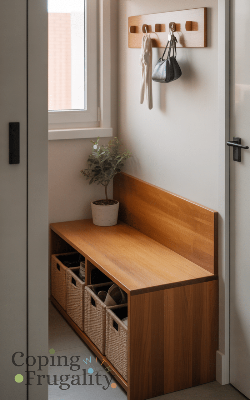 Shoes can quickly ruin even the prettiest entryway decor for apartments on a budget. Instead of piling them by the door, use a slim shoe rack, shoe bench, or vertical organizer. Many budget options are designed specifically for small spaces. Keeping shoes organized instantly makes your entryway look cleaner and more intentional, while also saving time when you’re heading out.
