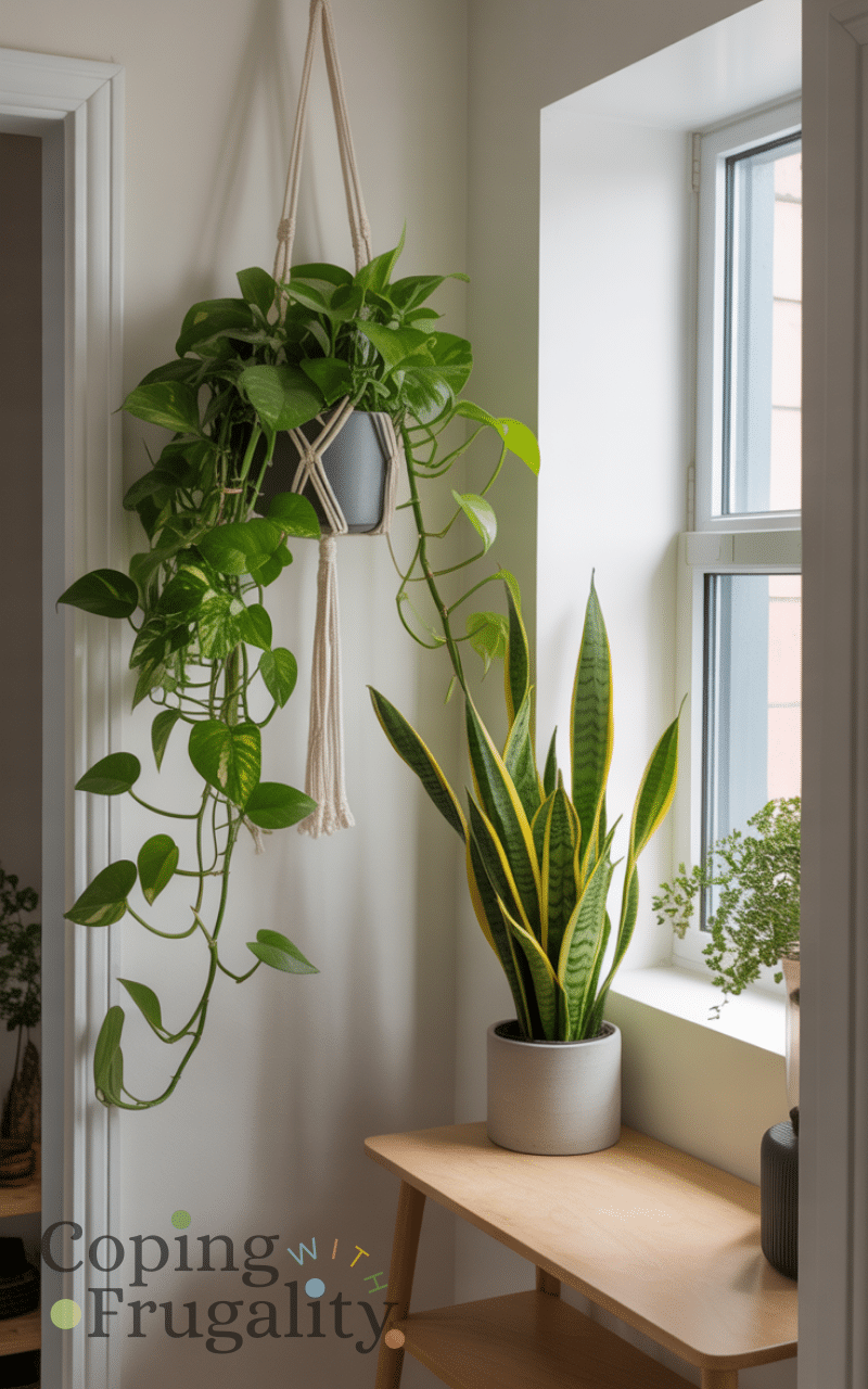 Plants instantly freshen up entryway decor for apartments on a budget. If your entryway gets natural light, choose low-maintenance plants like pothos or snake plants. No light? Faux plants work just as well and require zero upkeep. Place a plant on a console table, shelf, or even hang one from the wall. Greenery adds color, texture, and a cozy feel without costing much.
