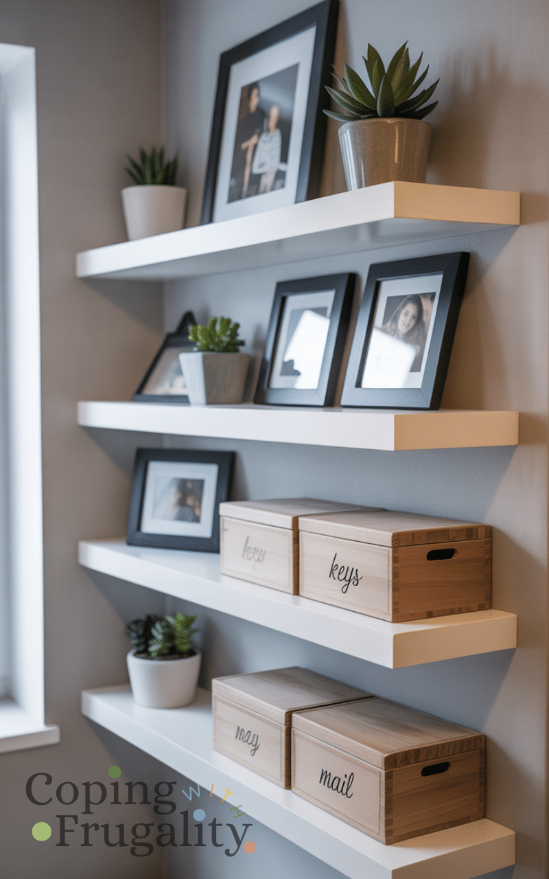 When floor space is limited, floating shelves are perfect for entryway decor for apartments on a budget. They give you storage without crowding the area. Use shelves to display small plants, framed photos, or decorative boxes for keys and mail. Install just one shelf for a minimal look, or stack two or three for extra storage. Floating shelves are inexpensive and easy to style, making them ideal for renters and small apartments.