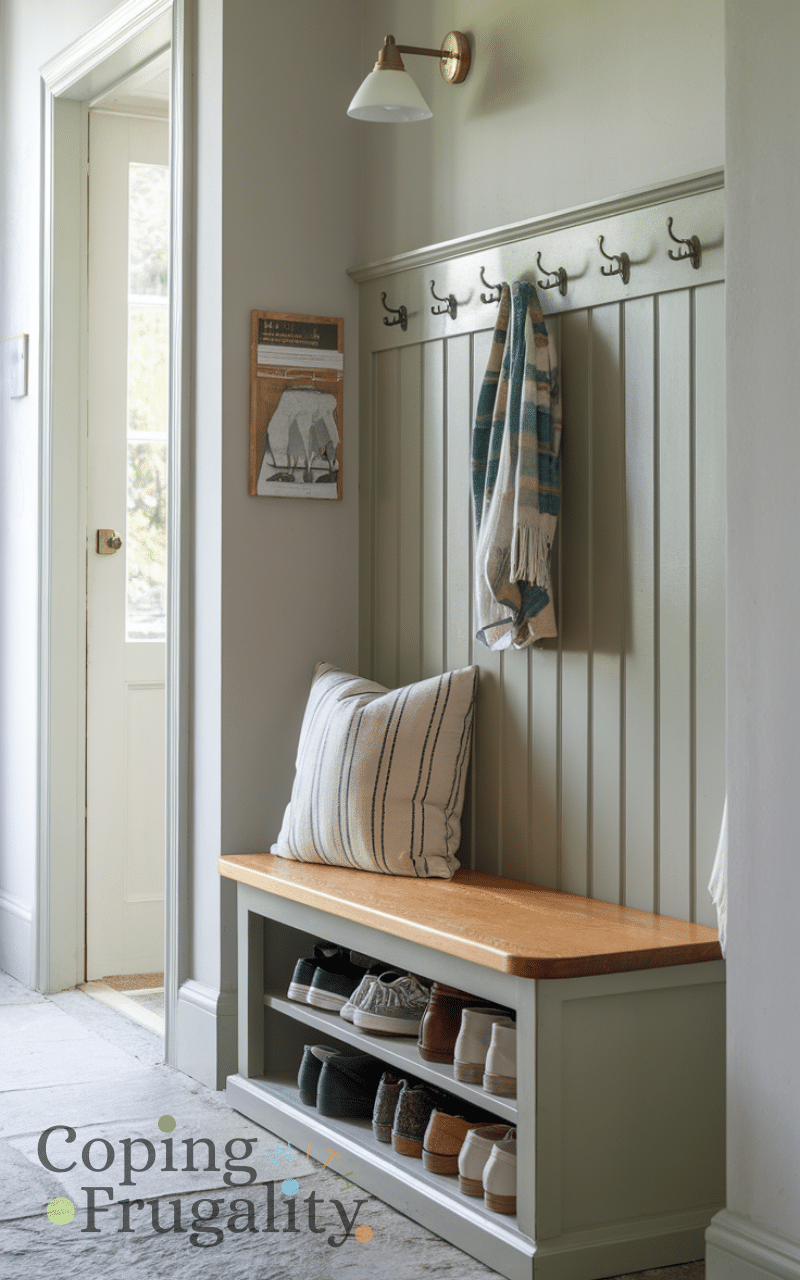 A multi purpose bench is one of the best Hallway Storage Ideas on a Budget because it gives you a sitting area storage space and a decorative element all in one and the storage inside the bench helps hide shoes and bags while the top offers a soft place to sit when putting on shoes and this idea helps keep the hallway tidy cozy and stylish without spending too much.