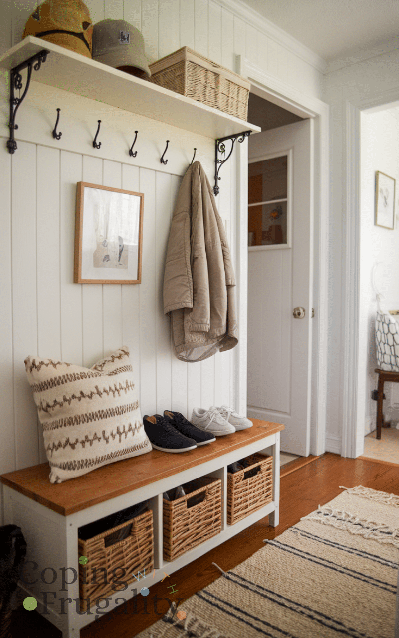 Using storage baskets under a small bench is one of the coziest Hallway Storage Ideas on a Budget because it gives you seating and hidden storage at the same time and the baskets are perfect for shoes or gloves or kids items and they help keep the hallway tidy and charming and this idea works well because the bench makes putting on shoes easier while the baskets keep everything out of sight and organized.