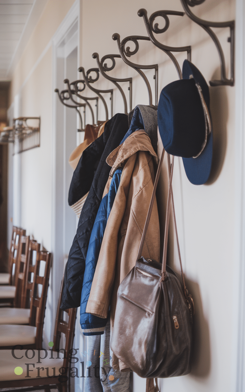 Side wall hooks are smart Hallway Storage Ideas on a Budget because they use narrow spaces that are often ignored and you can hang umbrellas or small bags or dog leashes so they stay easy to reach and this idea works well because side walls usually have just enough room for hooks without blocking movement and it helps the hallway look neat and purposeful.