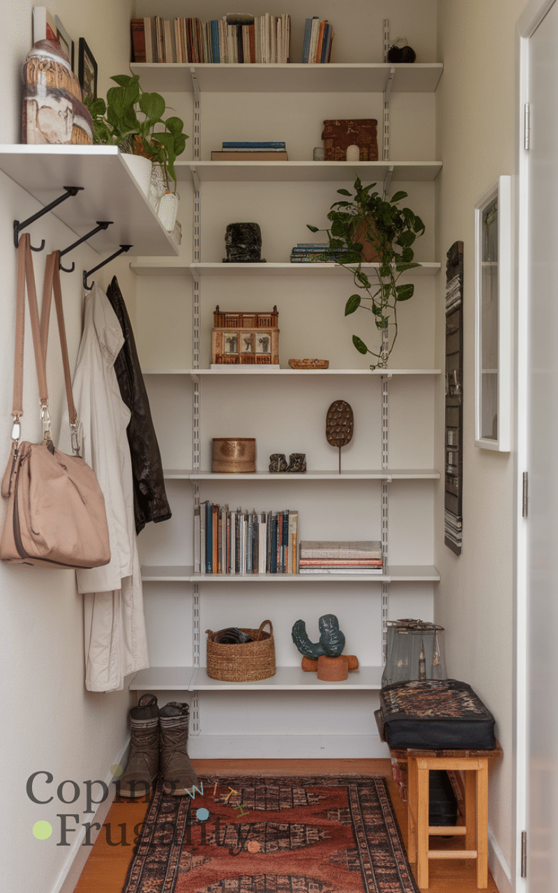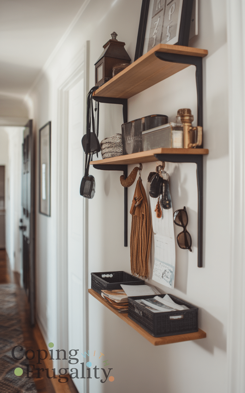 Floating shelves are perfect Hallway Storage Ideas on a Budget because they use wall space instead of floor space and they help you store keys and sunglasses and mail so the area stays neat and easy to manage and you can install two or three shelves vertically to save space and create a decorative look at the same time and this idea works beautifully in narrow hallways because it brings function and style together while keeping your spending low and it gives your hallway a light and airy feel.